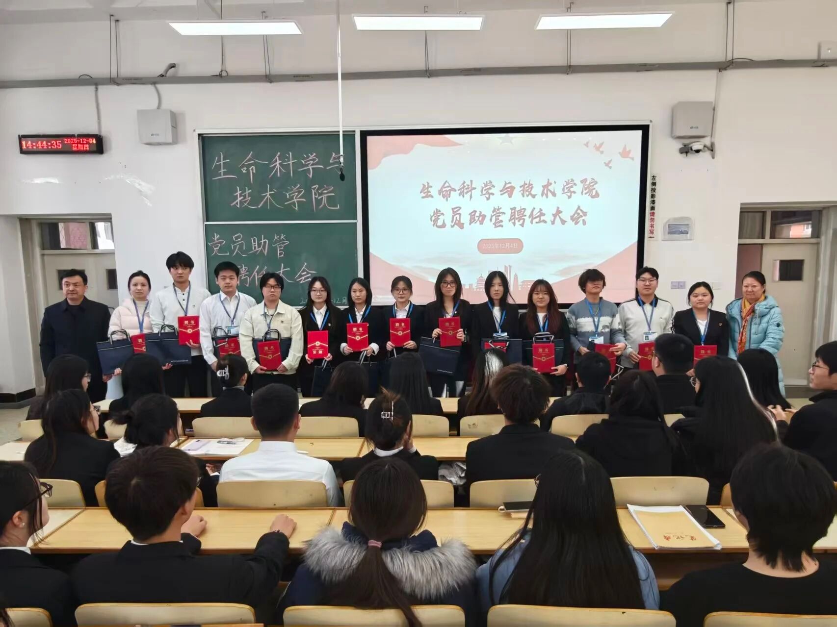 聘任仪式在庄严的氛围中拉开序幕。公司党委书记李德超宣读公司关于聘任党员助管的决议。随后,公司学工办负责人乌日根老师宣读了受聘党员助管名单。在热烈的掌声中,公司领导和年级辅导员依次为2025级、2024级、2023级及2022级的党员助管颁发了承载着信任与责任的聘书并佩戴工作证,领导和老师与同志们合影留念。