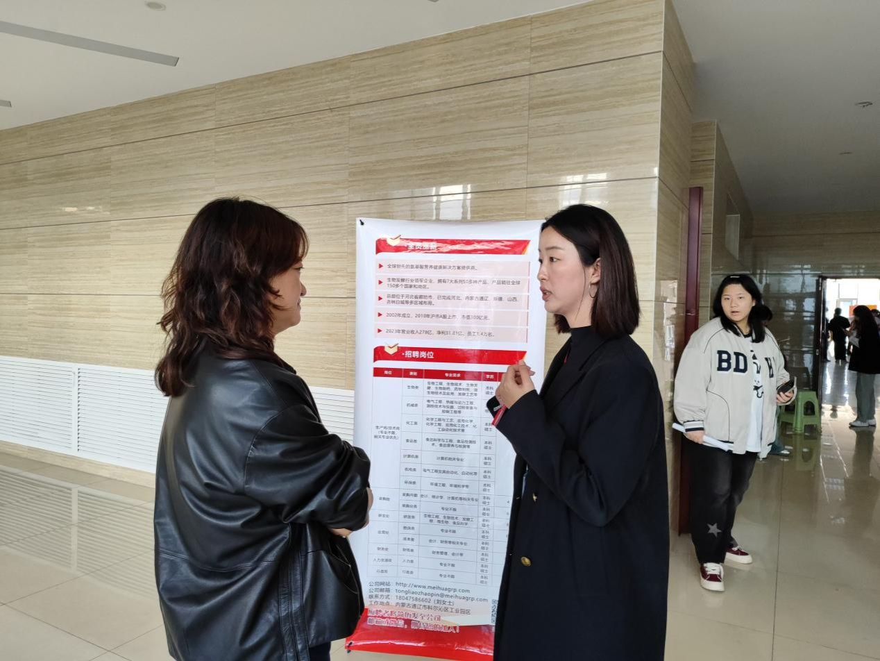 近日,联邦制药(内蒙古)有限公司、通辽梅花生物科技有限公司来公司举办专场招聘会。招聘会前,公司党委书记李德超与两位企业招聘负责人就公司2025届毕业生情况、公司的校招计划、岗位招聘需求、薪资待遇等方面进行深入沟通交流。