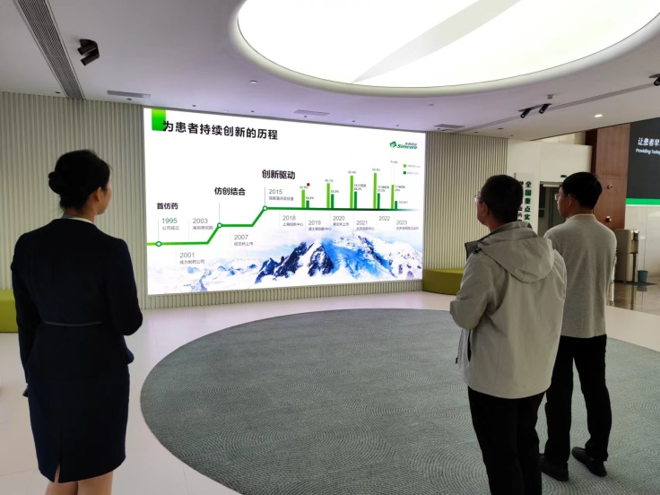 12日下午,系主任程立坤一行走访了江苏先声药业有限公司,公司人力资源部HRBP王玥经理、房雪婷经理等热情接待,先后参观了先声药业转化医学与创新药物国家重点实验室和集团历史馆,专业的讲解人员为老师们讲解了先声药业的发展历程及主营业务板块。