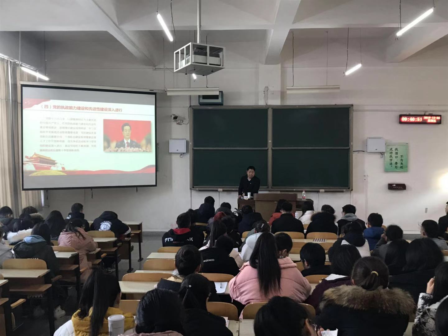 12月6日上午,公司副董事长冯志强在春晖学堂F208教室为公司近140名2019级本科生讲授《形势与政策》课。