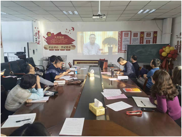 随后,全体党员集中观看了黄大年先进事迹的视频,视频讲述了著名战略科学家黄大年不忘初心、至诚报国的感人事迹,讴歌了改革开放给我国科技事业带来的巨大变化,塑造了新一代科技工作者的英雄形象,展现了以黄大年同志为代表的科技工作者赤诚的爱国情怀和忘我的奋斗精神。黄大年这样说:“我不是落叶,我是一粒种子,渴望良田的种子”,在他的心中只有一个家,那便是他的祖国。黄大年“心有大我、至诚报国”的崇高精神,以及“励志做一颗种子回馈祖国”的深刻情感,引发了在座师生们内心深处地共鸣与思考。
