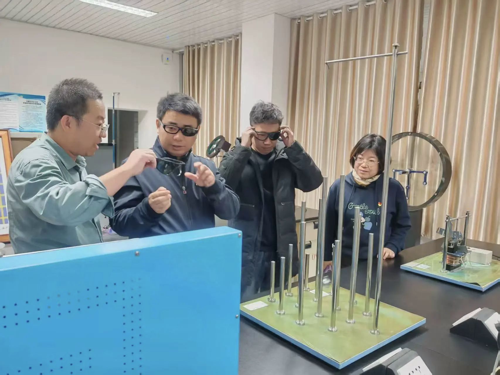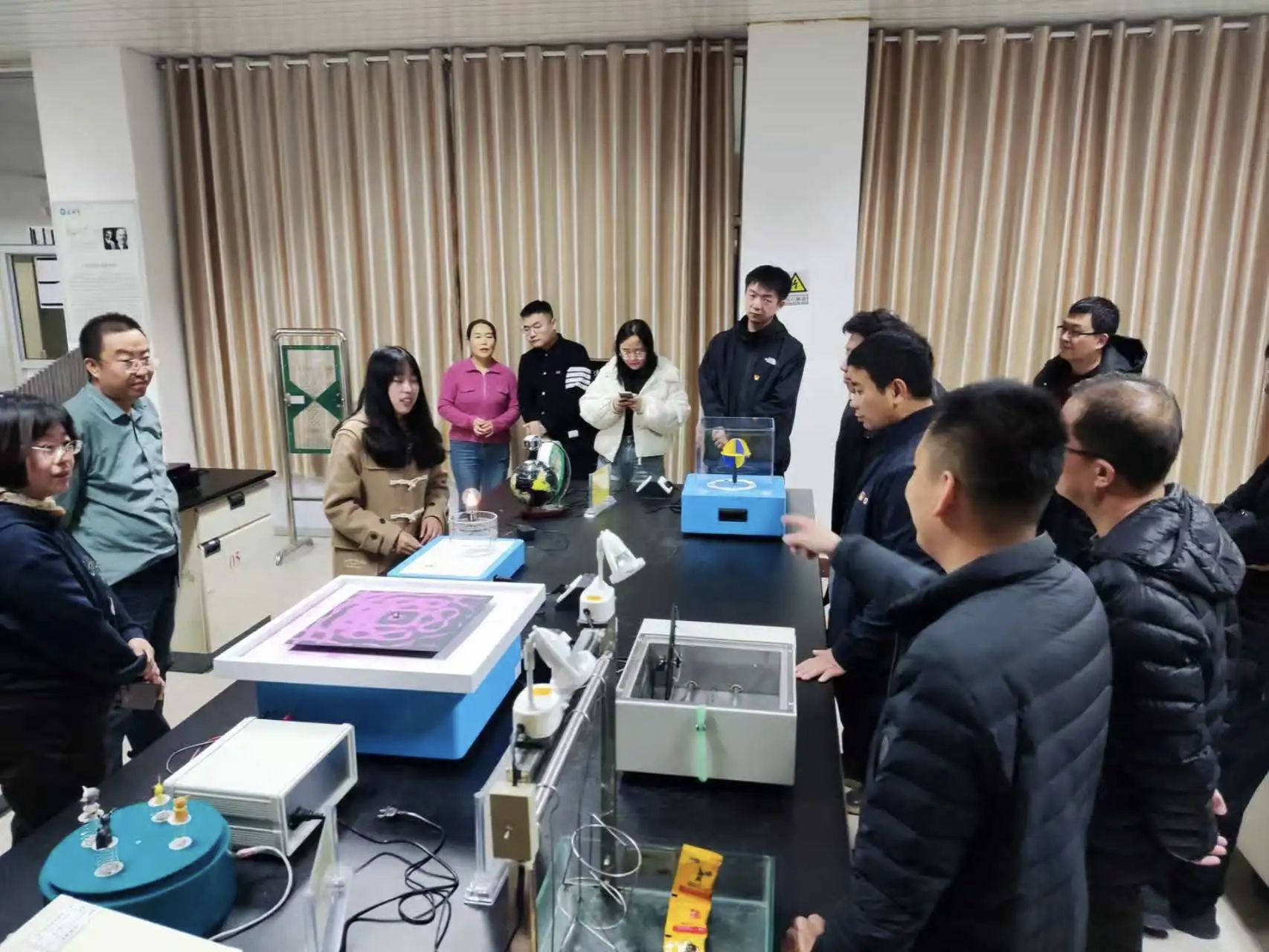 活动伊始,支部党员代表与各校教师共同参观了理公司物理科普实验室。通过辉光球、电磁感应演示试验仪、光纤通信、磁悬浮灯泡等70余个经典实验场景的沉浸式体验,党员教师亲身体验了物理与电子科学系在科普转化方面的成果,为进一步推动“党建+科普”融合提供了新思路。