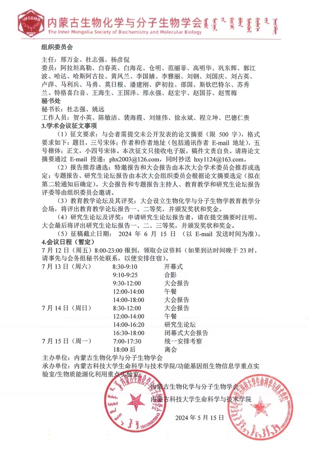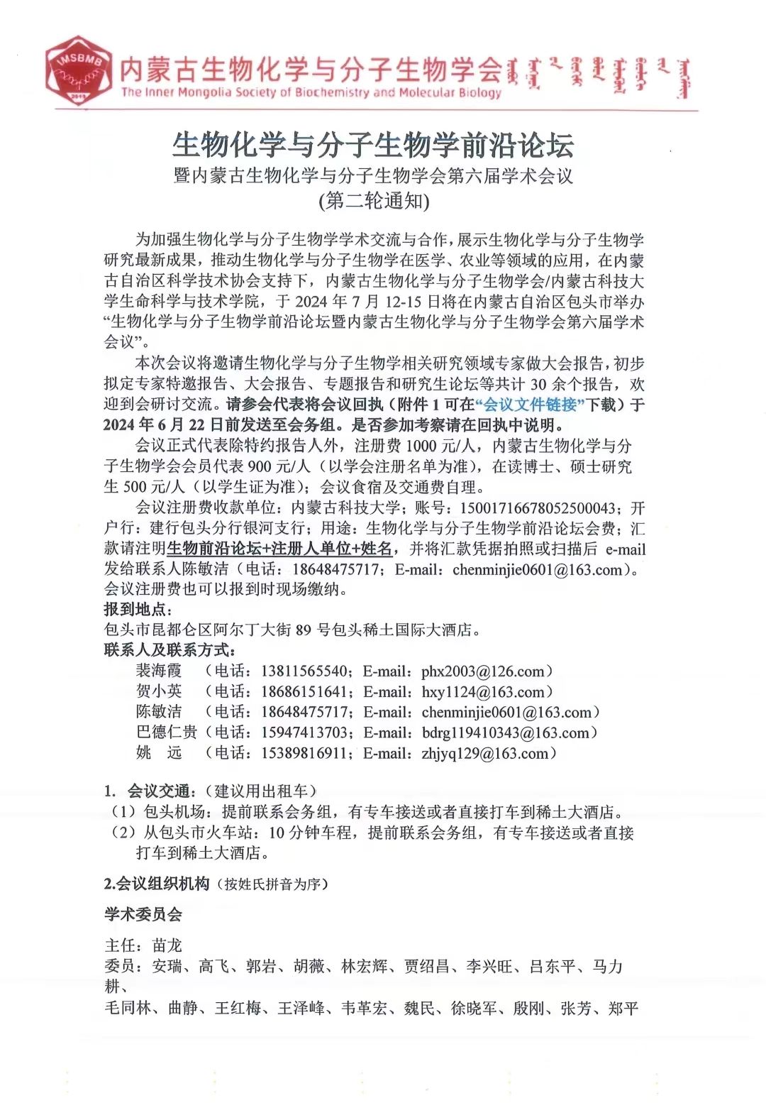 2024年“生物化学与分子生物学前沿论坛”_第二轮会议通知