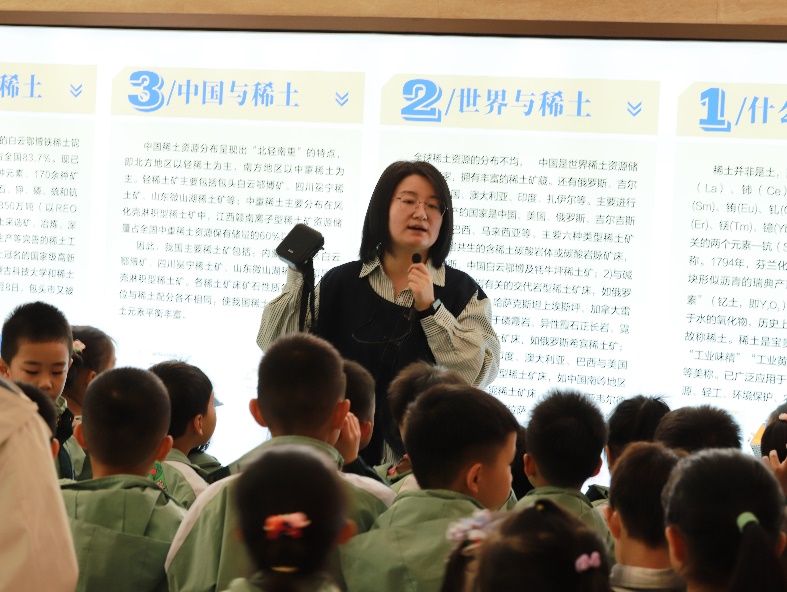 走进稀土产业公司的稀土产品展示厅,就像踏入了一个五彩斑斓的科学世界。赵烨老师如同知识渊博的导游,带领孩子们探索“工业维生素”稀土的奇妙应用。那些色彩斑斓的稀土矿石标本和互动模型,在赵老师的讲解下,成为了打开孩子们科学兴趣之门的钥匙。孩子们了解到稀土在电子设备、环保材料等众多领域的神奇作用,一个个眼神中满是对稀土元素“七十二变”的好奇与向往,探索科学的种子在他们心中悄然种下。